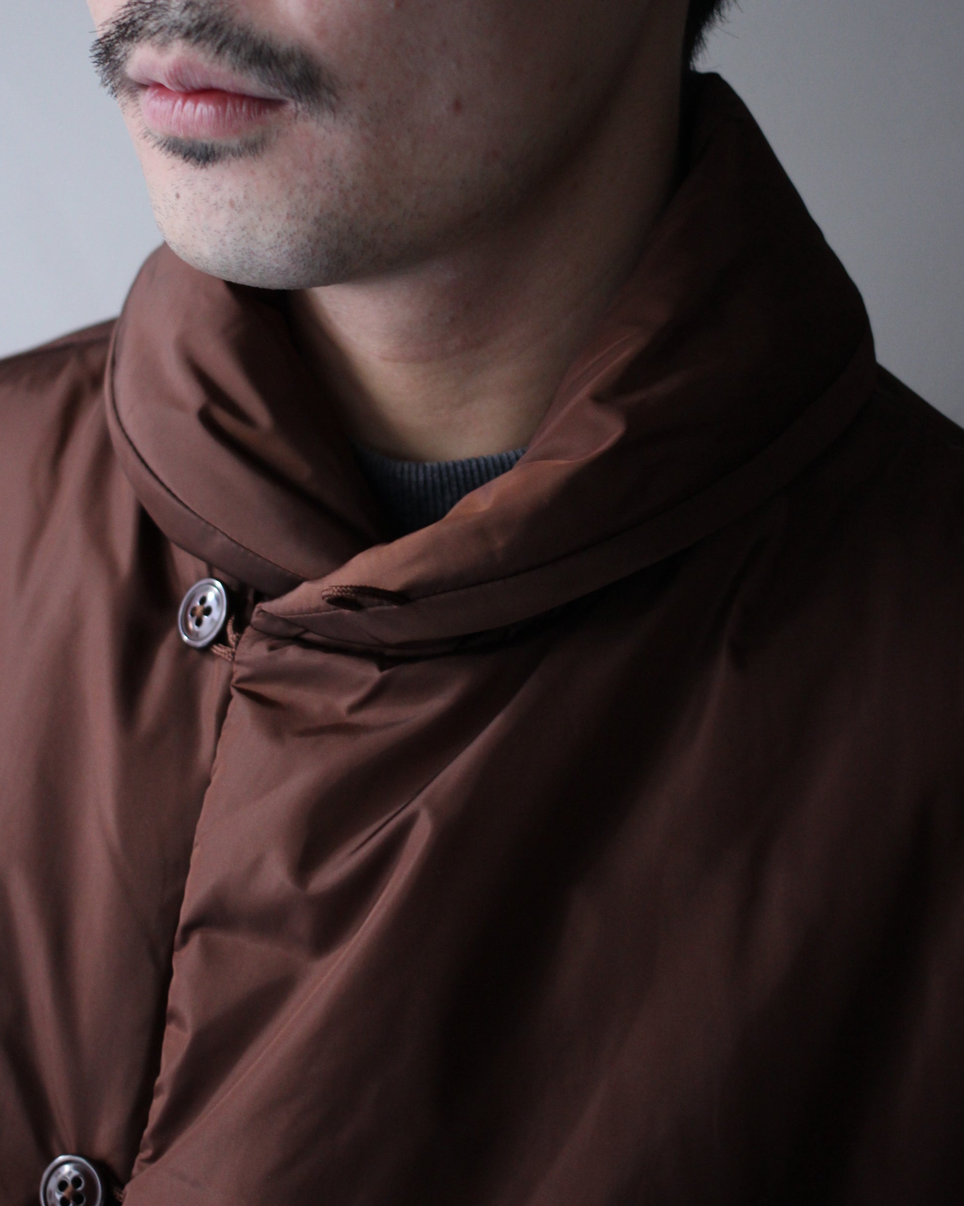 襟元は、あえてショールカラーを。フロントはジップではなく、ボタンで止める仕様となっており、生地を噛む心配がないのも特徴的です。