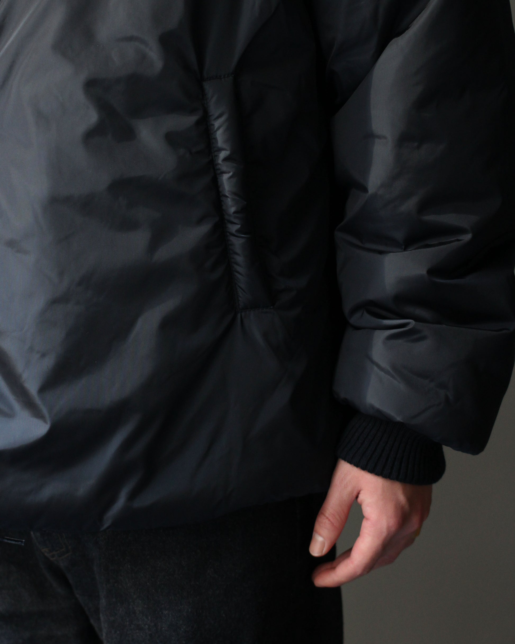 スタンドカラーとして完全防寒。襟元を広げてフーディとレイヤーしたり、マフラーなどの小物類と合わせた様々なスタイルをお楽しみいただけます。