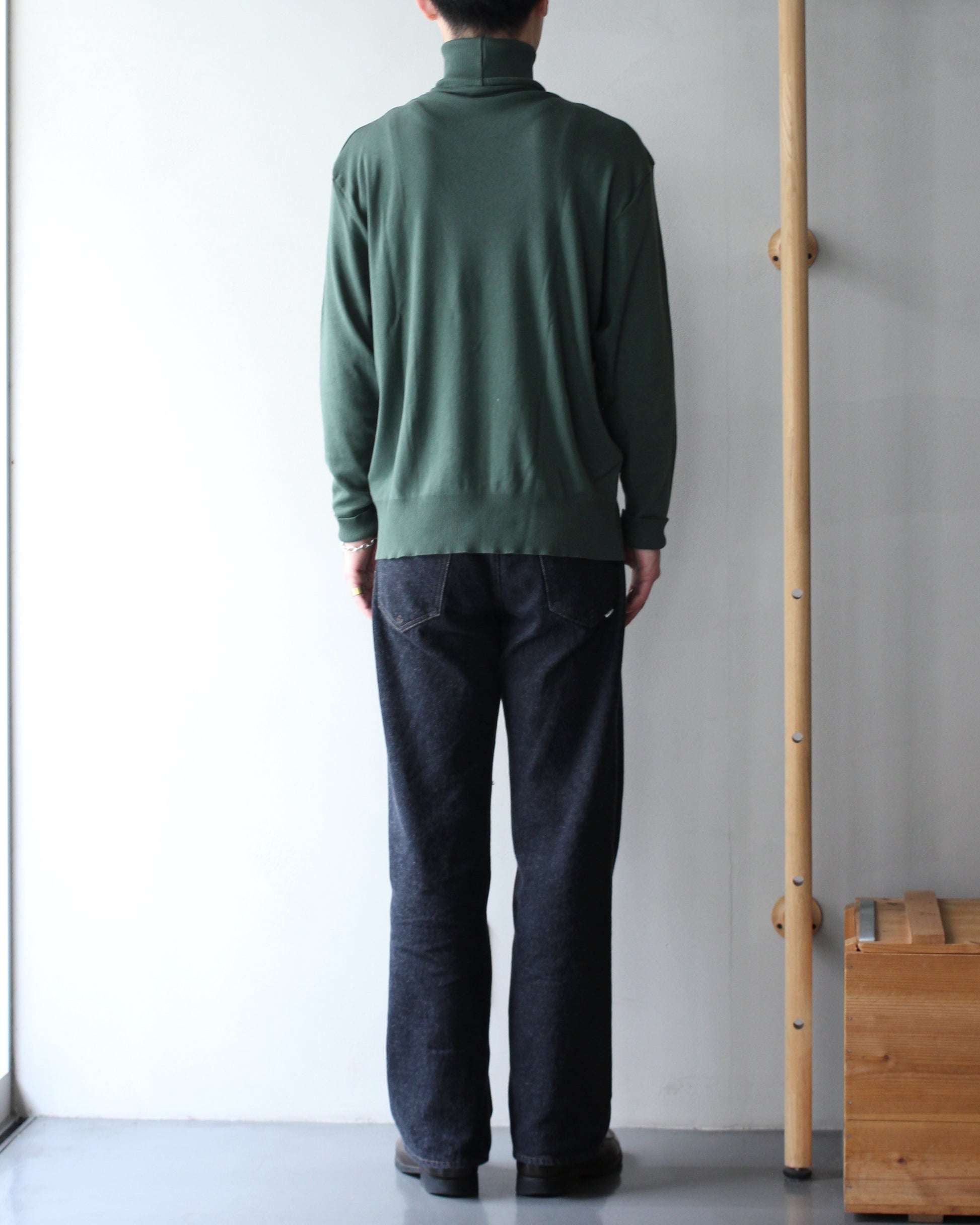 衿のタートル部分はシングルリブ仕様で締め付け感がなく、ソフトなフィット感。